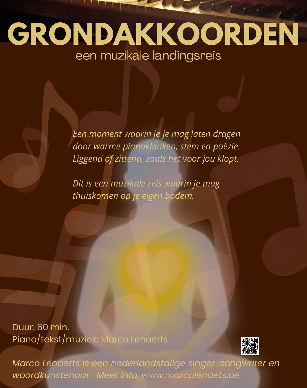 Dit is een ticket voor de mediatieve sessie Grondakkoorden op 19/4/2026 om 11u in Schulen, Herk-de-stad. Laat je een uur lang onderdompelen in een bad van muziek en poëzie, waarin je mag landen op eigen bodem.